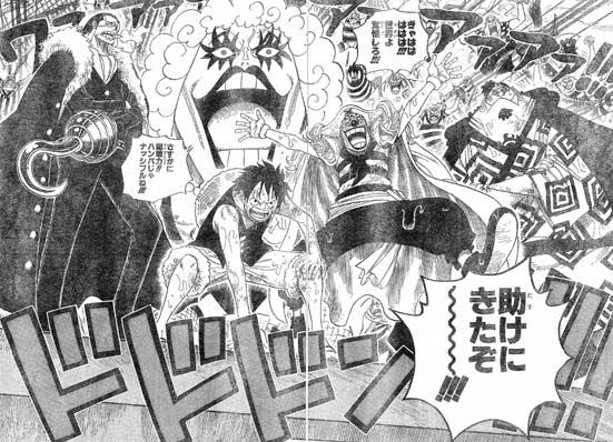 無謀にも単身で敵陣の中に突っ込んでくルフィ。